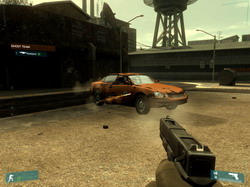 Вторая сцена, вне всякого сомнения, выглядит лучше с применением платы Ageia. Сноп искр, выбиваемый очередью из двери стоящей машины, весьма впечатляет, особенно в динамике – падающие и отскакивающие от асфальта искры имеют индивидуальные траектории и выглядят совсем как настоящие. К тому же, их значительно больше, нежели при отсутствии в системе процессора PhysX. Впрочем, сколько бы мы ни стреляли по этой машине, краска на боках не облупится, вмятин не будет, а при попадании в бензобак взрыва не произойдёт.