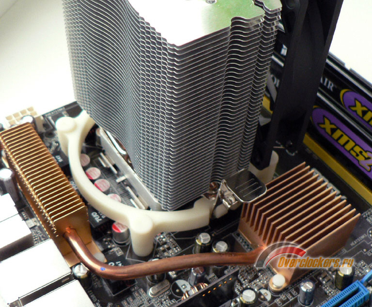 На этом же ракурсе видно, что пластины ребёр имеют форму, отдаленно напоминающую крылья бабочки. Кроме того, края рёбер профилированные, в результате чего достигается снижение сопротивления воздушному потоку и повышение эффективности кулера в целом. С одной стороны на радиаторе присутствуют специальные прорези, в которые вставляются проволочные скобки крепления вентилятора. Установка второго вентилятора конструкцией радиатора не предусмотрена.