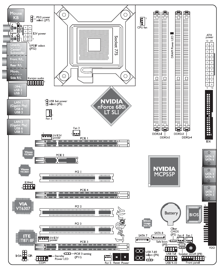 Суммируем богатые возможности материнской платы DFI LANPARTY UT NF680i LT SLI-T2R, воспользовавшись списком из руководства к плате.