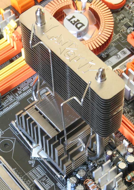 Проволочные скобки предназначены для крепления дополнительного вентилятора, их можно перенести на противоположную сторону радиатора, для этого в пластинах имеются соответствующие отверстия. Наличие дополнительного обдува очень рекомендуется, так как чипсет греется очень сильно, особенно при разгоне. Даже такой увеличенной площади системы охлаждения недостаточно, случалось, что температура чипсета по данным материнской платы достигала 72°С. Вероятно, следует использовать вентилятор 50x15 мм, так как расстояние до процессорного кулера и ближайшей видеокарты не позволяет установить вентилятор стандартной толщины 25 мм. У меня такого под рукой не нашлось, и я использовал вентилятор 50x10 мм. Крепление на него не рассчитано, но они и не потребовалось во время проверки на открытом тестовом стенде.