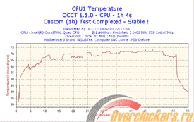 Все тесты были проведены в операционной системе Windows XP Professional Edition SP2. Для мониторинга температуры процессора использовалась программа SpeedFan версии 4.32, поддерживающая считывание показаний температуры непосредственно из регистров процессоров (CPU Sensor). Разогрев CPU осуществлялся с помощью программы OCCT (OverClock Checking Tool) версии 1.1.0 при 60-минутном периоде тестирования, из которого первая и последние 4 минуты – время простоя системы: