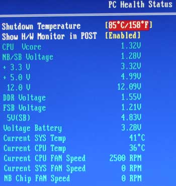 Эксперименты по выяснению оверклокерских возможностей материнской платы Biostar TP35D3-A7 Deluxe были начаты с новой версией BIOS. Однако плата запускалась, но не могла загрузить Windows даже на стартовой частоте 450 МГц. Изучение данных мониторинга в разделе PC Health Status показало, что напряжение на процессоре не поднимается и остаётся номинальным. Не желая возиться с очередной нестабильной версией BIOS, которая "теряет" Serial ATA и неспособна увеличить Vcore, я, как это не раз бывало с предыдущей платой, вернулся к старой версии BIOS. C ней всё оказалось только хуже, хотя все напряжения соответствовали установленным. Плата не смогла стартовать на частоте FSB 450 МГц, 430 МГц и 410 МГц. На 390 МГц она, наконец, запустилась, но Windows так и не загрузила.
