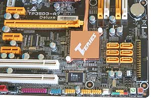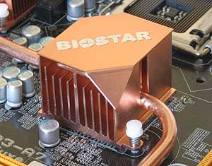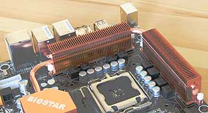 Заканчивается трубка на одном из радиаторов, установленных на транзисторах MOSFET. Здесь берёт начало другая трубка, соединяющая оба радиатора. Во время работы платы Biostar TP35D3-A7 Deluxe все радиаторы заметно нагреваются, имеют примерно одинаковую температуру, что говорит о высоком качестве системы охлаждения.