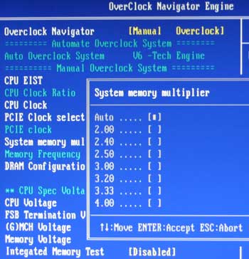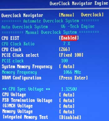 Возможности раздела OverClock Navigator Engine тоже остались практически неизменными, только верхняя граница FSB опустилась до 600 МГц, а на память можно подать до +0.35 В с шагом 0.05 В.