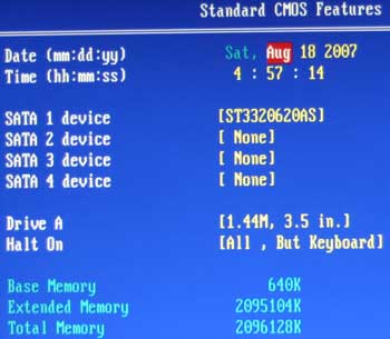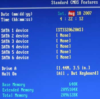Материнская плата Biostar TP35D3-A7 Deluxe поступила к нам с версией BIOS от 31.05, а на сайте уже имелась новая, датированная 15.06. На этот раз всё обошлось без подвохов, новая версия была действительно новой, но сюрпризы встретились немедленно. Старая ревизия BIOS демонстрировала вполне стандартное окно Standard CMOS Features.