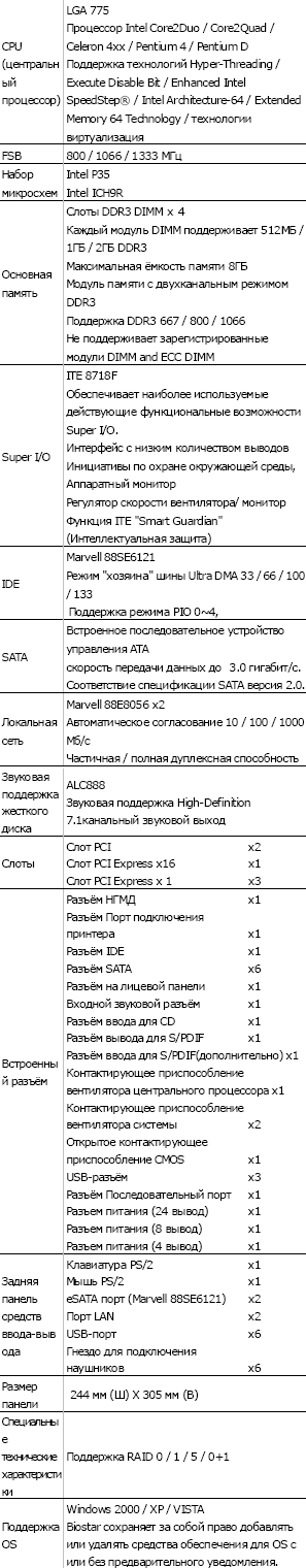Традиционная таблица с перечнем технических характеристик дополняет и суммирует наши знания о материнской плате Biostar TP35D3-A7 Deluxe ver.5.0.
