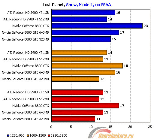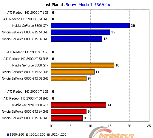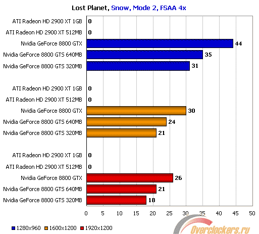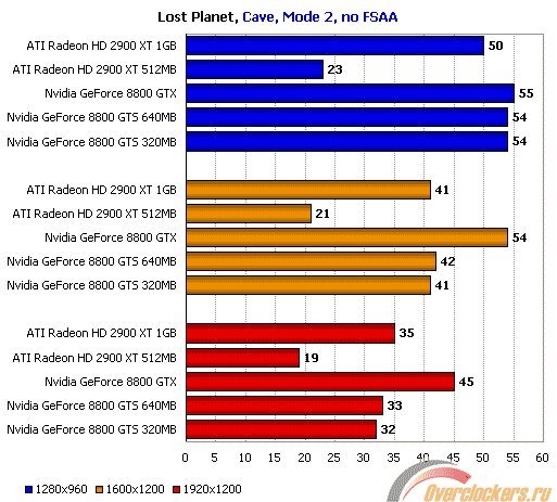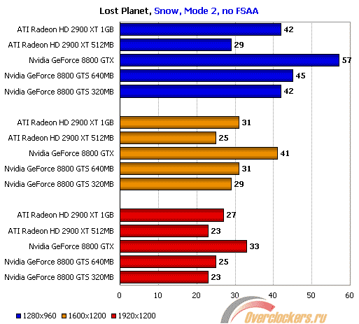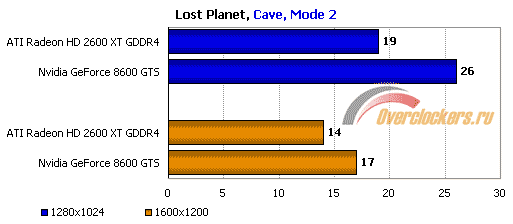 Игра Lost Planet была протестирована с помощью двух демок, поскольку обе демонстрируют разную степень и характер нагрузки на GPU. К сожалению, графические карты ATI Radeon HD 2900 XT не смогли активировать FSAA в данном приложении, а также рисовали изображение с артефактами (которых не было на других моделях ATI Radeon HD 2000), что указывает на недоработки в драйверах, или самой Lost Planet demo.