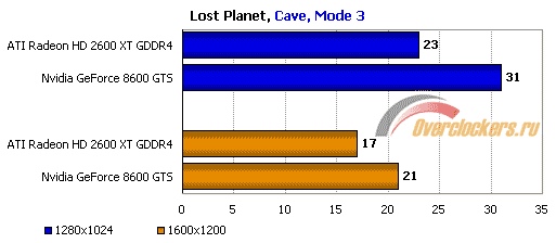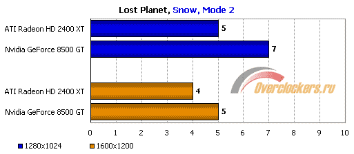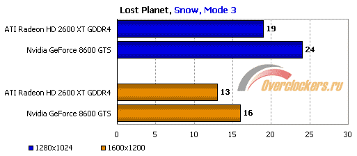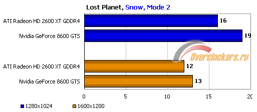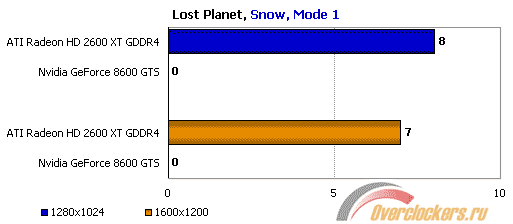 Отметим, что Nvidia GeForce 8600 GTS заметно опережает Radeon HD 2600 XT в Lost Planet на уровне Snow. Тем не менее, данную победу можно скорей считать пирровой, поскольку игра выключится как только минимальный фпс не будет соблюдён.