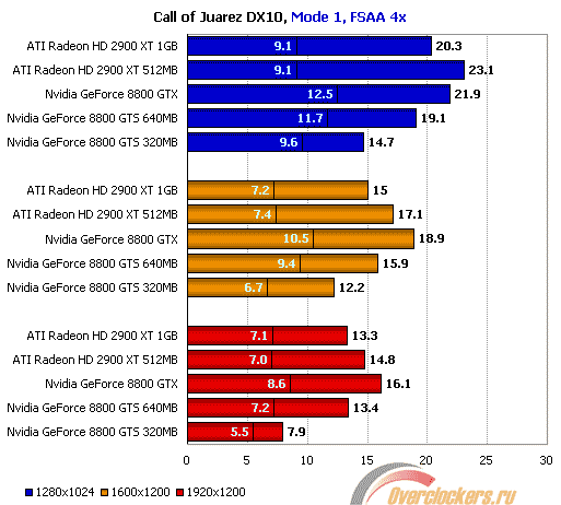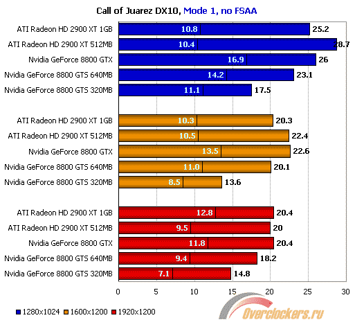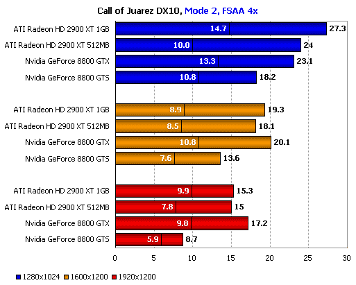 При условии, что скорость какой-либо из представленных графических карты не превышает 28 кадров в секунду (fps), мы не можем говорить о том, что какая-либо из имеющихся на рынке графических карт может похвастаться действительно высокой скоростью в Call of Juarez DX10 при высоком качестве графики. Примечательно, однако, что Radeon HD 2900 XT может конкурировать с более дорогим GeForce 8800 GTX.