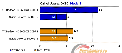 Будучи одной третьей и одной четвертой частью от своих собратьев, нацеленных на рынок высокопроизводительной 3Д графики, ATI Radeon HD 2600 XT GDDR4 и Nvidia GeForce 8600 GTS показывают вполне предсказуемые результаты, которые обличают невозможность использования обоих продуктов для DirectX 10 версии игры Call of Juarez.