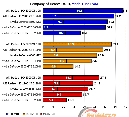 Отрыв, который ATI Radeon HD 2900 XT 1GB GDDR4 демонстрирует по части минимальных fps продолжает впечатлять: если в случае с первым режимом тестированя Company of Heroes DX10 он составлял подчас 100% от Nvidia GeForce 8800 GTX, то в случае с данным режимом тестирования разрыв увеличивается до 200%.