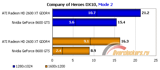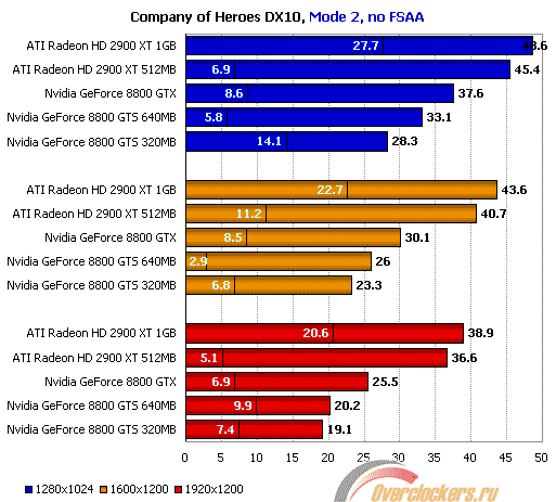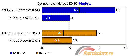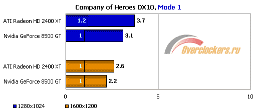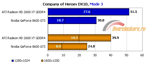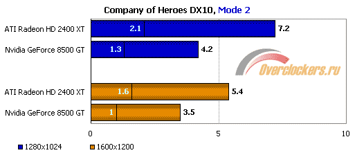 Хотя Radeon HD 2400 XT продолжает удерживать лидерство, едва ли 18 fps интересны тем, кто собирается играть в Company of Heroes DX10.
