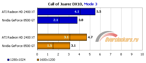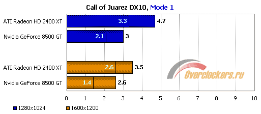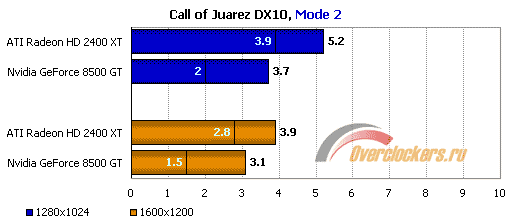 Можно констатировать, что ATI Radeon HD 2400 XT несколько более быстрее своего более дорогого конкурента в DirectX 10 версии Call of Juarez.