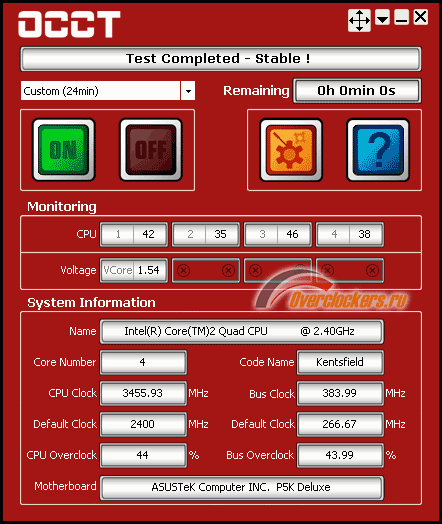Система автоматической регулировки оборотов вентиляторов кулеров (Q-Fan) в BIOS материнской платы была выключена. Контроль срабатывания термозащиты процессора Intel Core 2 Quad осуществлялся с помощью программы RightMark CPU Clock Utility версии 2.30. У тестового экземпляра процессора режим пропуска тактов (throttling) определен эмпирическим (т.е. опытным) путём и активировался по достижении температуры в ~82 градуса Цельсия и выше.