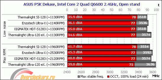 Несмотря на то, что разница по максимальной частоте четырёхъядерного процессора, достигнутая на каждом из кулеров, не слишком велика, у нас появился явный лидер. Им стал Thermalright Ultra-120 eXtreme, позволивший процессору стабильно функционировать на недостижимой ранее частоте в 3636 МГц. Новая материнская плата, дальнейшее повышение напряжения CPU и высокоэффективный вентилятор также сыграли свою роль, так как ранее из этого же экземпляра процессора Intel Core 2 Quad Q6600 под Ultra-120 eXtreme удавалось "выжать" только 3357 МГц.