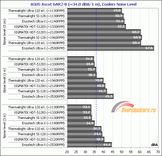 Измерение уровня шума систем охлаждения определялось по хорошо знакомой постоянным посетителям сайта методике. Субъективно комфортный уровень шума в 36 дБА отмечен на диаграмме штриховой полосой, а фоновый уровень шума системного блока без процессорного кулера, измеренный с расстояния в 1 метр, не превышал 34 дБА.