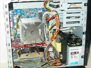 Оставшаяся часть сборочной процедуры, вы будете смеяться, заняла часа два, причем большая часть этого времени была занята не работой, а напряженной мыслительной деятельностью на тему "как запихать девять человек в запорожец, чтобы десятому хватило места сыграть на баяне". Первый привет от разработчиков настиг меня, когда я вставил материнку на место и собрался ее прикрутить - тут же пришлось ее доставать обратно, потому что резьба в стойках, вместо привычной М3, оказалась дюймовой. Набрав новых винтиков, прикрутил-таки мать - только для того, чтобы через полчаса вынуть ее снова, "уперевшись" в невозможность нормальной укладки IDE-шлейфа. Началось испытание на сообразительность, причем первая инстанция в таких случаях - мануал - мне ничем помочь не смогла. Там было прекрасно расписано, какие коннекторы куда идут, но отсутствовало самое главное - в какой последовательности! А проблема была вот в чем. Как я уже упоминал, HDD-бокс висит на своем кронштейне почти без зазоров, и это накладывает определенные ограничения на укладку как проводов питания самого диска, так и всех близлежащих. А именно - любое натяжение проводки прижимает бокс к кронштейну, и конструкция тут же "подает голос". Чтобы этого избежать, нужно, с одной стороны, обеспечить интерфейсному шлейфу и проводам питания диска достаточную слабину, чтобы они не тянули бокс на себя, с другой - проложить все остальные провода так, чтобы они не пытались свалиться в зазор между боксом и видеокартой и, опять-таки, не прижали первый к кронштейну. В конечном итоге, изведя на промежуточные попытки все стяжки из комплекта и половину своих собственных, я получил вот что: