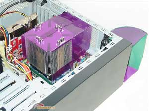 Надо заметить, что на открытом стенде эта система прекрасно работает на голой конвекции, и в корпусе хоть с какой-то вентиляцией перегреться не может в принципе. Так что полученные в процессе тестирования температурные показатели нас будут интересовать исключительно как предмет сравнения с традиционной АТХ-конфигурацией. Чтобы у вас была более осязаемая точка отсчета, приведу современные аналоги по тепловыделению: это Core2Duo E6xxx и 8600 GT, довольно распространенное на сегодняшний день сочетание. Доработанный радиатор на видеокарте, разумеется, никаких "магазинных" аналогов не имеет, но они появятся очень скоро - прежде всего, это Accelero S2 от тех же Arctic Cooling.