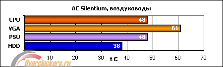 Самое интересное здесь - температура процессора. Она всего на два градуса выше, чем в корпусе с работающими вентиляторами, что подтверждает догадку о том, что пассивный радиатор без дополнительных воздуховодов в Silentium'е практически не продувается. Еще забавнее тот факт, что Ascot, продуваемый тремя "стодвадцатками", этот же пассивный радиатор умудряется "душить", образуя аккурат в соответствующем месте застойную зону! Соответствено, любителям тишины на заметку: 6ARx (а также основанные на том же шасси модели Thermaltake) - не лучший вариант корпуса для использования с минимальным количеством вентиляторов. По поводу остальных компонентов системы сказать особо нечего: в допуск уложились, да и ладно.