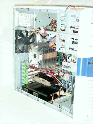 Не удержавшись, дал Ascot'у еще несколько очков форы, избавив его от пары врожденных недостатков, не свойственных АТХ-системам в целом: вынул воздушный фильтр и выкусил перемычки из вентиляторных корзин. SQD, принимая во внимание его неспособность обеспечить сколько-нибудь сносную виброизоляцию, на штатное место в пятидюймовый отсек прикручивать не стал, а положил, как это обычно делается, на дно корпуса на листе поролона. Чтобы ликвидировать горячий карман в районе видеокарты, все PCI-заглушки были вынуты. Вот, как все это выглядело: