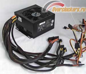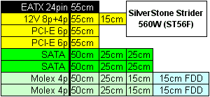 Все кабели намертво впаяны в плату блока и заключены в черную пластиковую оплетку. Длина кабелей достаточна для большинства корпусов, разве что кабель питания процессора мог быть чуть длиннее. В корпусах с нижним расположением БП, вроде SilverStone Temjin 09/10 длины в 55 сантиметров может едва хватить.