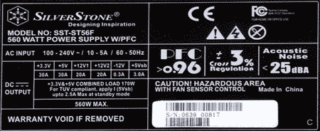 Этикетка блока указывает о наличии разделения +12В канала на две ветки, с максимальным допустимым током каждой 20А. Производитель заявляет о 3% допуске возможных отклонений напряжения от номинального, однако нигде нет ни слова о тестовых условиях. Напомним, что согласно рекомендациям стандарта ATX 2.2 максимальная величина погрешности не должна превышать 5% величины.