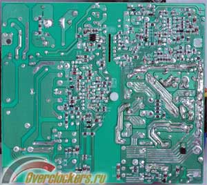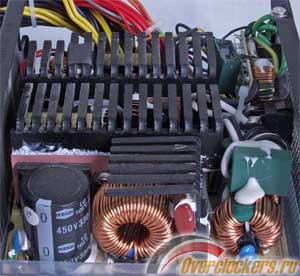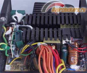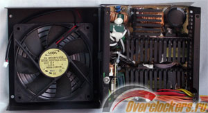Анодированные радиаторы из алюминия весьма просты по конфигурации и не отличаются особой массивностью. Это еще не показатель низкой эффективности, ведь они расположены прямо напротив вентилятора, и практически весь воздух, продуваемый через блок, приходится на ребра радиаторов. Блок оснащен схемой активного корректора мощности, что заставляет помнить о совместимости с блоками бесперебойного питания. Печатная плата имеет одностороннюю разводку проводников.