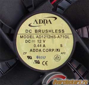 Охлаждение компонентов блока питания осуществляется вентилятором ADDA (модель AD1212HS-A71GL). Корпус вентилятора имеет габариты 120 х 120мм, при толщине 25мм. Двигатель оснащен подшипником скольжения, а литера H расшифровывается как High Speed, что в переводе на человеческий язык означает максимальные 2200 оборотов за минуту, при воздушном потоке 85.2 CFM и шуме почти 40дБ. Благодаря же автоматическому снижению оборотов, блок практически не слышен в обычных конфигурациях, даже с довольно прожорливыми комплектующими.
