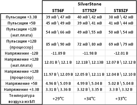 Для полноценного тестирования электрических параметров мощных ATX БП необходим тестовый стенд, позволяющий независимо нагружать каждый из каналов. Работы над стендом ведутся, а пока приходится ограничиться проверкой источников в реальной пользовательской компьютерной конфигурации. Измерения пульсаций блоков питания производились с помощью четырехканального осциллографа Tektronix 2246-1Y с максимальной полосой пропускания сигнала 100 МГц, чего с большим запасом достаточно для выявления всех возможных помех. При возникновении коротких замыканий силовых линий на землю, а также при превышении основных силовых напряжений (+3.3, +5 и +12) изделия SilverStone исправно выключались, предотвращая возможность повреждений. Токовая защита канала +12В успешно отключала блоки при достижении порогового значения порядка 20-22А.