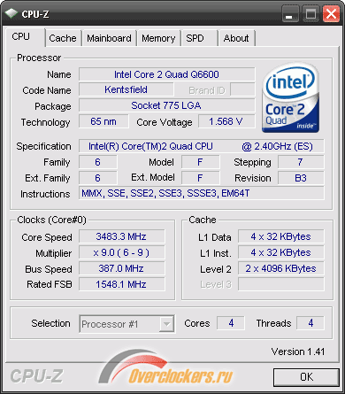Четырёхъядерный процессор был разогнан до своего максимума на хорошем воздушном охлаждении и текущих условиях внутри корпуса системного блока. В результате итоговыми оказались 3483 МГц при напряжении, выставленном в BIOS материнской платы в 1.6625 В: