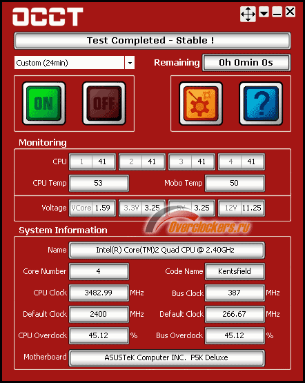 Разогрев CPU осуществлялся с помощью программы OCCT (OverClock Checking Tool) версии 1.1.1b в режиме максимальной нагрузки на процессор при 24-минутном периоде тестирования из которого первая и последние 4 минуты являются временем простоя системы и стабилизации температуры: