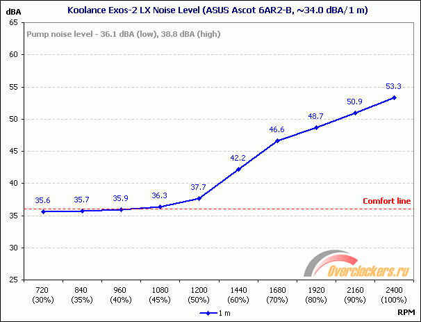 Самый интересный, как мне кажется, раздел сегодняшней статьи начнём нетрадиционно с изучения результатов тестирования систем охлаждения, а с проверки уровня шума Koolance Exos-2 LX, чтобы определить наиболее актуальный (то есть комфортный для постоянного использования) режим работы СВО. Для этого скорость вращения вентиляторов изменялась в ручном режиме по доступным 10 ступеням регулировки, а уровень шума замерялся с расстояния в ~1 метр. Помпа во время такой проверки была выключена. Результаты получились следующие: