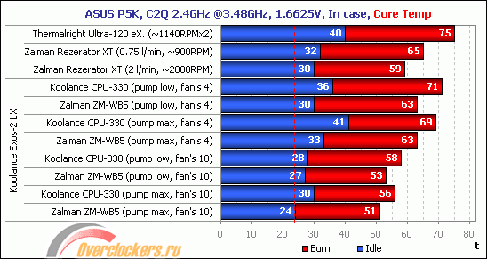 Прежде всего хотелось бы отметить низкую эффективность процессорного водоблока Koolance CPU-330. Обратите внимание, что в тихом режиме работы водоблок Zalman ZM-WB5 держит температуру процессора на 8(!) градусов ниже чем CPU-330. По правде сказать, я сначала надеялся, что водоблок от Koolance превзойдет по эффективности охлаждения новый водоблок от Zalman, но оказалось совсем наоборот. С увеличением мощности помпы и скорости вращения вентиляторов разница между водоблоками сокращается, но Zalman ZM-WB5 всё-равно впереди.