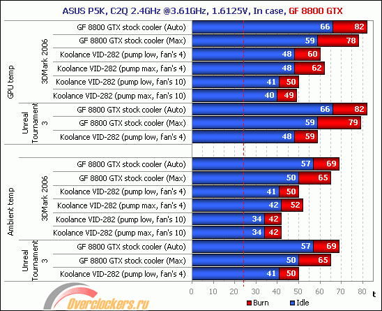 Разница в температуре со стандартной системой охлаждения GeForce 8800 GTX более чем впечатляет. Столь горячая видеокарта даже в тихом режиме работы СВО не прогревается выше чем 60 градусов по графическому процессору и 50 по температуре окружения. Более того, по термодатчику Koolance Exos-2 LX, подвешенному внутри закрытого корпуса системного блока в пространстве примерно между видеокартой и процессором, оказалось, что установка водоблока на видеокарту вместо стандартной системы охлаждения снизила температуру воздуха после 1 часа игры в Unreal Tournament 3 внутри корпуса с 50 до 34 градусов Цельсия! И это при том, что турбина системы охлаждения GeForce 8800 GTS выбрасывает нагретый воздух из корпуса системного блока. Какая разница будет с видеокартами, системы охлаждения которых не выбрасывают нагретый воздух из корпуса, остаётся только догадываться...