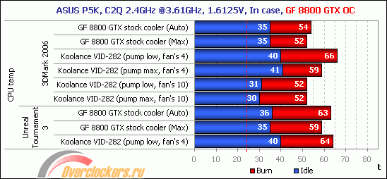 Даже зацикленный на час тест Firefly Forest из синтетического бенчмарка 3DMark 2006 не нагружает центральный процессор (это видно по разнице в температуре CPU с водоблоком видеокарты в цепи и без него). В Unreal Tournament 3, напротив, температура четырёхядерного процессора резко возрастает даже с использованием стандартной системы охлаждения на GeForce 8800 GTX и при исключении её водоблока из СВО. Только увеличение скорости вращения вентиляторов и повышение мощности помпы позволяют снизить все температуры.