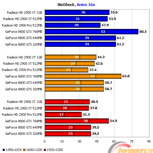 Несмотря на использование некоторых продвинутых спецэффектов, в частности, воды с динамической физической моделью, BioShock вовсе не отличается чрезмерной требовательностью, свойственной некоторым играм с поддержкой DirectX 10. К примеру, при максимальных настройках детализации сцены, Nvidia GeForce 8800 GTX легко обеспечивает комфортный уровень производительности во всех разрешениях, включая 1920х1200, и даже минимальная производительность обоих вариантов GeForce 8800 GTS не падает в этом разрешении ниже 25 fps.