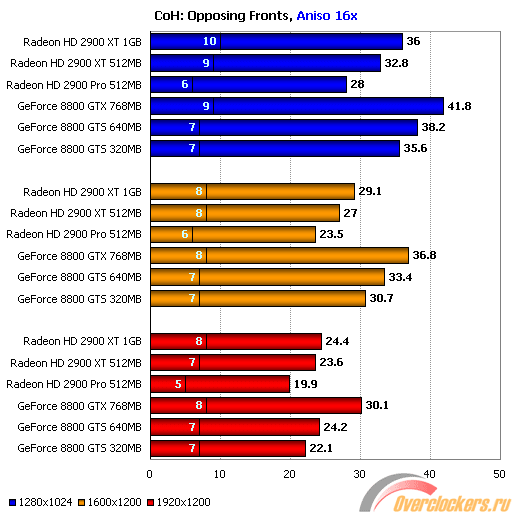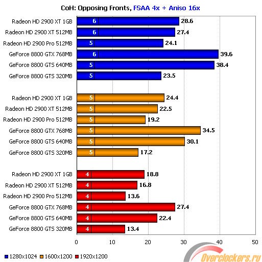 Производительность семейства ATI Radeon HD 2900 в Opposing Fronts осталась практически такой же, как и в оригинальной игре, а вот решения Nvidia серьезно укрепили свои позиции, и GeForce 8800 GTX удалось вырваться в лидеры.