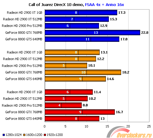 В более качественных режимах начинает сказываться наличие на борту ATI Radeon HD 2900 XT 1GB вдвое большего объема видеопамяти, нежели у обычной модели, однако, при этом, производительность всех решений ATI, а также Nvidia GeForce 8800 GTS 320MB чрезвычайно низка. Кроме того, последний не смог пройти тест в разрешении 1920х1200 с той же ошибкой, что и в предыдущих играх.