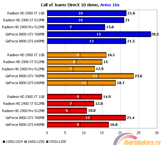 Необходимо сразу отметить, что расстановка сил со времени предыдущего тестирования игр с поддержкой DirectX 10 заметно изменилась: если со старыми версиями драйверов GeForce 8800 GTX едва опережала ATI Radeon HD 2900 XT, то теперь детище Nvidia получила твёрдое первое место вследствие того, что производительность решения ATI упала.