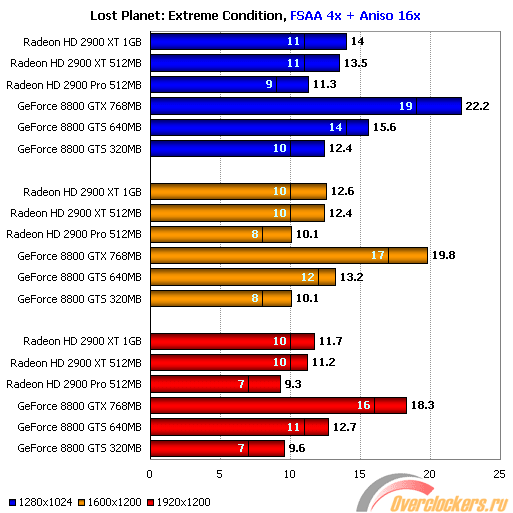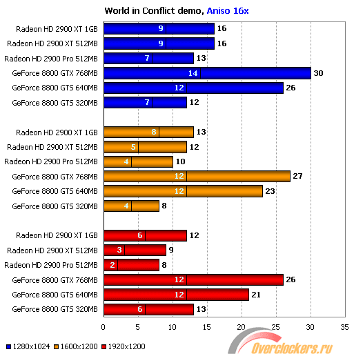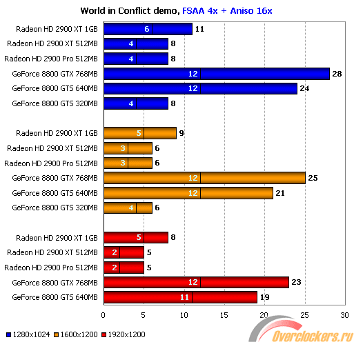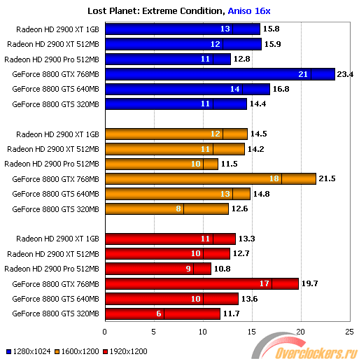 В результаты ATI Radeon HD 2900 и конкурирующего Nvidia GeForce 8800 GTS весьма близки, хотя последний выглядит несколько лучше, в особенности это касается минимальных значений fps. Учитывая, что минимальное количество отрисованных кадров падает у ATI Radeon HD 2900 XT ниже 25 за секунду в разрешении 1920x1200, это делает их менее привлекательным выбором для владельцев мониторов с диагональю 23”-24”, в то время, как для обладателей мониторов с разрешением 1280х1024 и 1600х1200/1680х1050 выбор между GeForce 8800 GTS и Radeon HD 2900 XT практически равноценен.