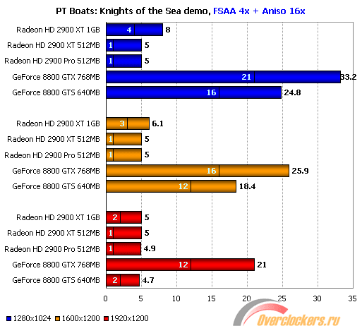 Расплата за включение сглаживания в PT Boats очень высока: с задачей не справляется даже GeForce 8800 GTX, чья минимальная производительность падает ниже допустимого значения 25 кадров в секунду. Остальные карты теряют в скорости еще сильнее, особенно это касается решений ATI Radeon HD 2900. Очевидно, что включение FSAA 4x в данной игре вряд ли будет хорошей идеей даже в полной версии.