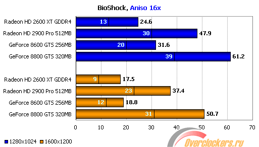 В данном случае ошибка, наблюдаемая ранее только с GeForce 8800 GTS 320MB, проявила себя и в случае GeForce 8600 GTS. Драйверы ForceWare 163.69 определенно нуждаются в доработке. Лишь ATI Radeon HD 2900 Pro прошёл тест без проблем, показав сравнительно неплохой результат в разрешении 1280х1024. Впрочем, это отнюдь не означает, что он приемлем с точки зрения игрока, тем более, учитывая поведение более производительных моделей Radeon HD 2900. Не исключено, что ситуация улучшится с выходом новых версий ATI Catalyst.