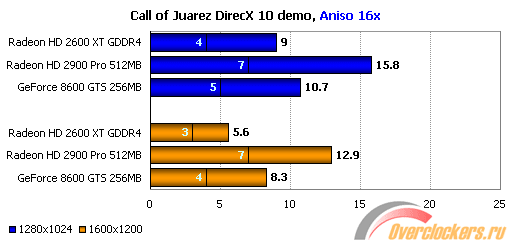 Так как DX10-версия Call of Juarez активно использует эффекты, базирующиеся на комплексных математических вычислениях, лидерство ATI Radeon HD 2900 Pro выглядит полностью закономерно. К сожалению, с практической точки зрения это не представляет ценности, так как производительность всё равно находится ниже минимально приемлемого уровня. Это касается всех представителей категории mainstream.