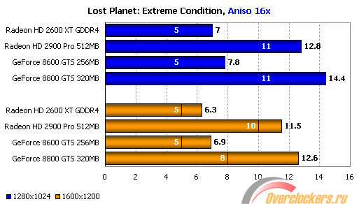 Ни одна из карт, представленных в категории mainstream, не обеспечивает минимально приемлемой средней производительности при максимальных настройках детализации. Ближе всего к этому, разумеется, оказываются карты, построенные на базе высокопроизводительных GPU ATI R600 и Nvidia G80, с некоторым преимуществом Nvidia GeForce 8800 GTS 320MB над ATI Radeon HD 2900 Pro. Последнее также свидетельствует о том, что по-настоящему продвинутые спецэффекты в Lost Planet действительно не используются.