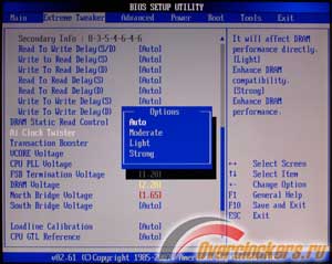 Подбор необходимых делителей в BIOS Setup выполняется достаточно просто. Плата для каждого делителя сразу показывает результирующую частоту памяти, зависящую от частоты FSB. Кроме того, рядом отображается информация о таймингах, выставляемых платой по умолчанию, что также может помочь при конфигурировании подсистемы памяти.