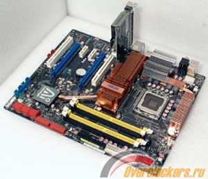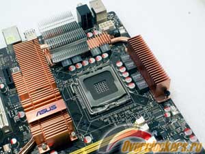 Система охлаждения достаточно громоздка и занимает много места на плате. Поэтому, с установкой массивных кулеров на ASUS P5E могут возникнуть проблемы. В то же время даже Scythe Infinity на плату влезает, правда, с очень большими трудностями.