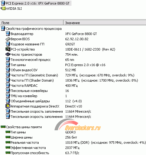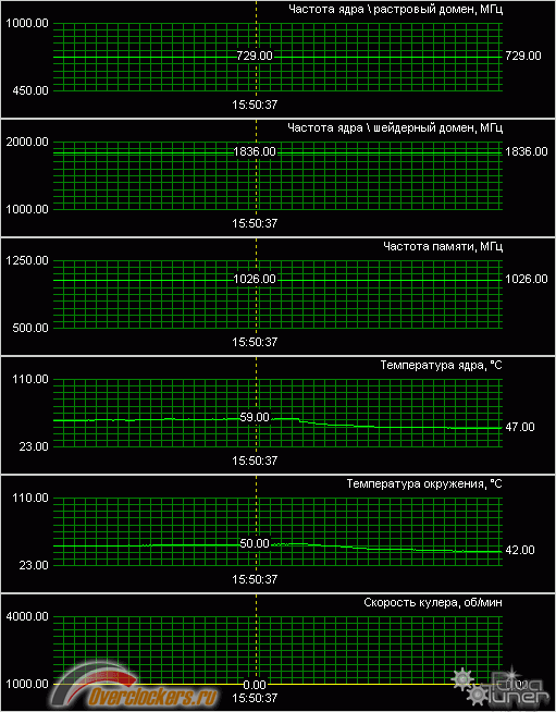 Проверка оверклокерского потенциала видеокарты, как вы понимаете, проводилась с этой же системой охлаждения. В результате без потери в стабильности и качестве картинки удалось достичь частоты в 729 МГц по графическому процессору (1836 МГц шейдерный домен) и в 2036 МГц по видеопамяти: