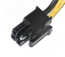 Но, может быть, виновата не материнская плата? Может это блок питания не выдержал нагрузки? Другого БП под рукой не оказалось, но есть материнская плата abit IP35 Pro, сможет ли она работать с этим блоком питания? Я начал разбирать тестовый стенд и не смог вытащить четырёхконтактный коннектор питания процессора ATX12V, он намертво прикипел к разъёму на материнской плате. Сделать это удалось только после долгих усилий, с помощью подручных инструментов и оказалось, что пластиковая окантовка одного из контактов коннектора расплавилась и намертво спаялась с разъёмом на материнской плате.