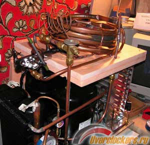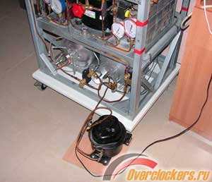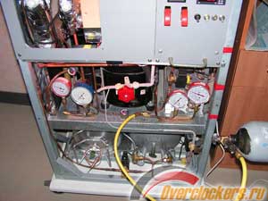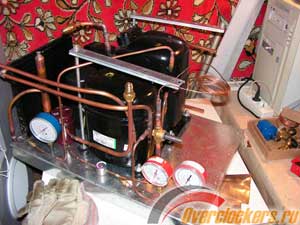 Вот первый вариант каскада собран. Тогда у меня еще не было CPEV, и вместо него я поставил переделанный ТРВ. Не было также низкотемпературного хладагента. Поэтому, для проверки, обе ветви заправил 22-м фреоном. И вот, что у меня получилось.