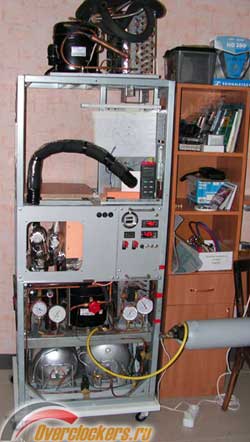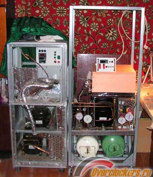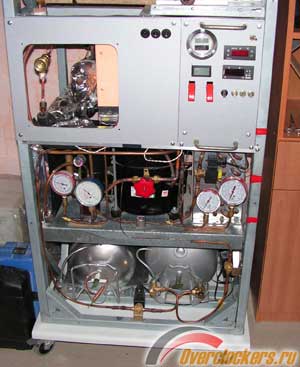 Во как. Каскад получился даже больше моего старого проекта с двумя фреонками. Да, размеры хоть куда. Высота 1м 64см, ширина 66см. Глубина 50см. Внизу виден отсек с двумя баллонами из-под фреона. Это будущие расширительные емкости. Одна для нижней ступени, вторая впрок. Наверно все же буду расширять каскад на третью.